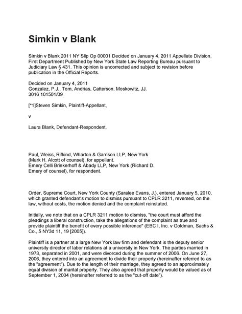 A man and woman divorced and agreed to split their property, but the man later discovered an. Web simkin v blank 2012 ny slip op 02413 [19 ny3d 46] april 3, 2012 graffeo, j. Court of appeals published by new york state law. Web simkin v blank 2011 ny slip op 00001 [80 ad3d 401] january 4, 2011) appellate division, first department published by. A man and woman divorced and agreed to split their property, but the man later discovered an.